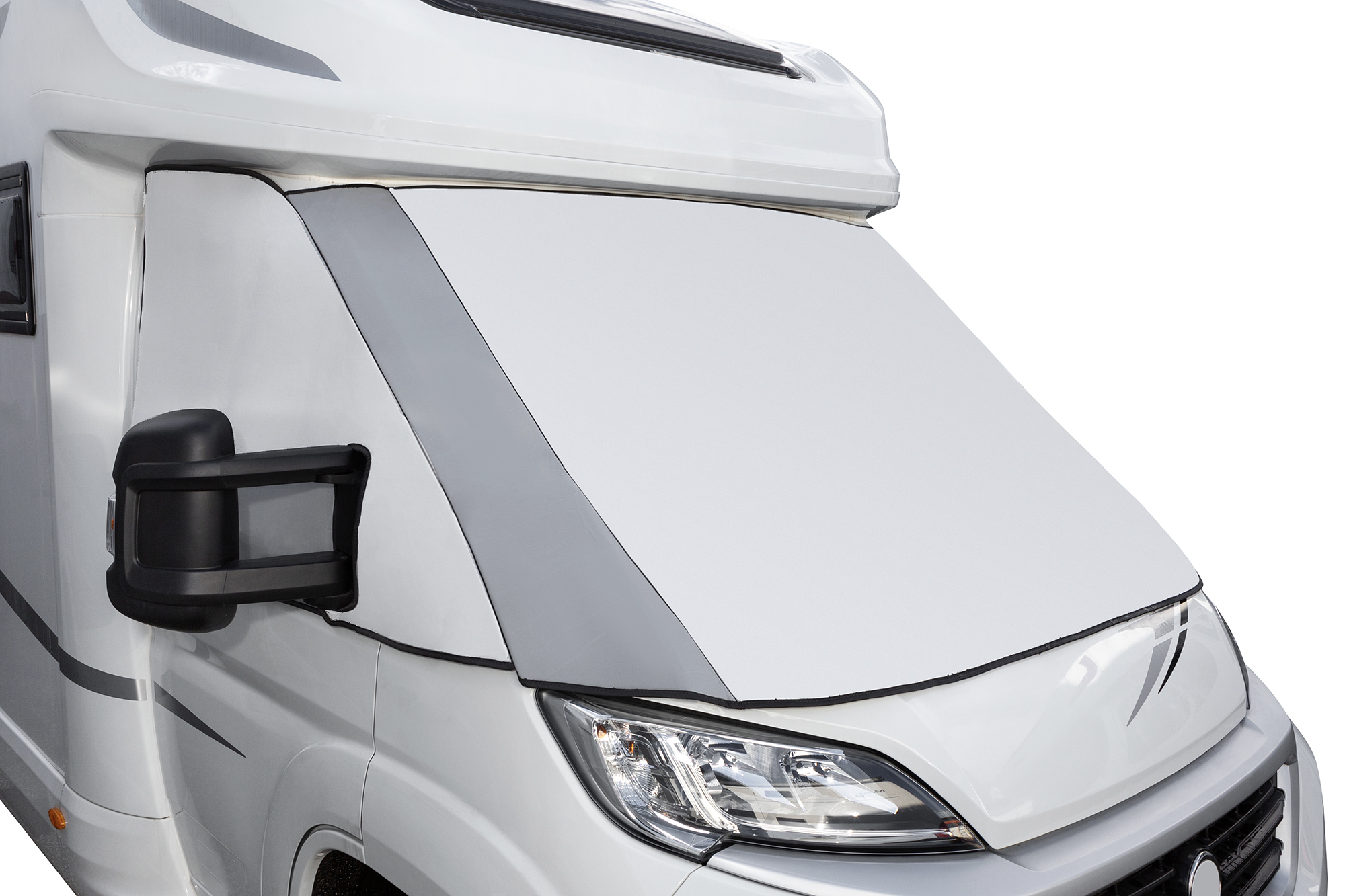 Nuovo materiale termico appositamente sviluppato per la copertura di veicoli ricreazionali che, grazie alla sua consistenza morbida, si adatta perfettamente ai contorni del parabrezza e dei finestrini laterali della cabina.